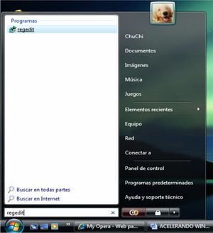 Escribimos regedit dentro del cuadro de diálogo de Ejecutar y hacemos clic en Intro o Enter (o bien escribimos regedit en el cuadro de búsqueda del menú Inicio de Windows Vista)