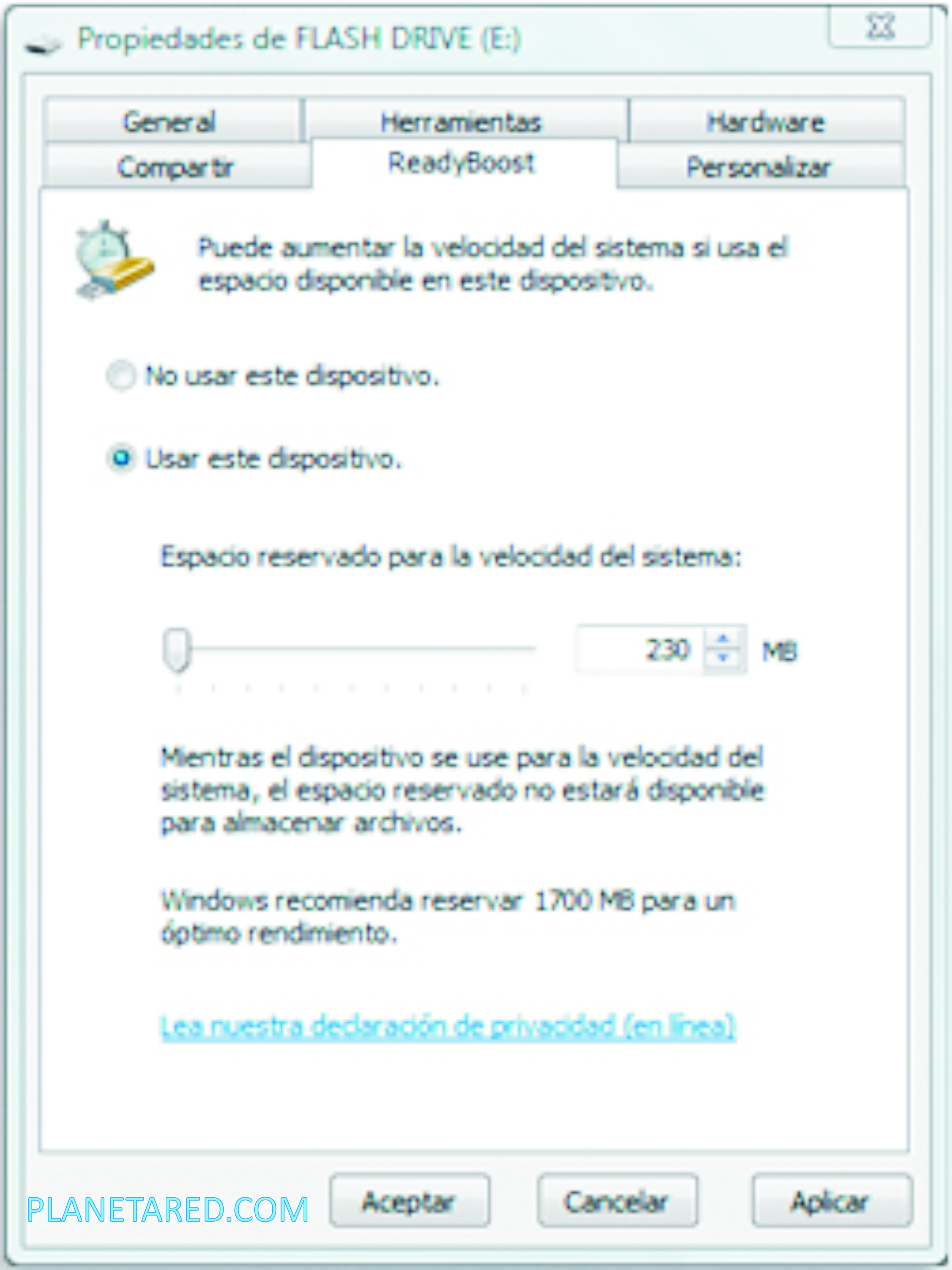 Con estos pasos hemos procedido a configurar el Windows ReadyBoost en nuestra memoria flash USB. Es bueno recordar que el espacio que se decida dedicar a esta Memoria Virtual, estará reservado y no podrá ser utilizado para almacenar datos, más allá del espacio restante en la memoria.