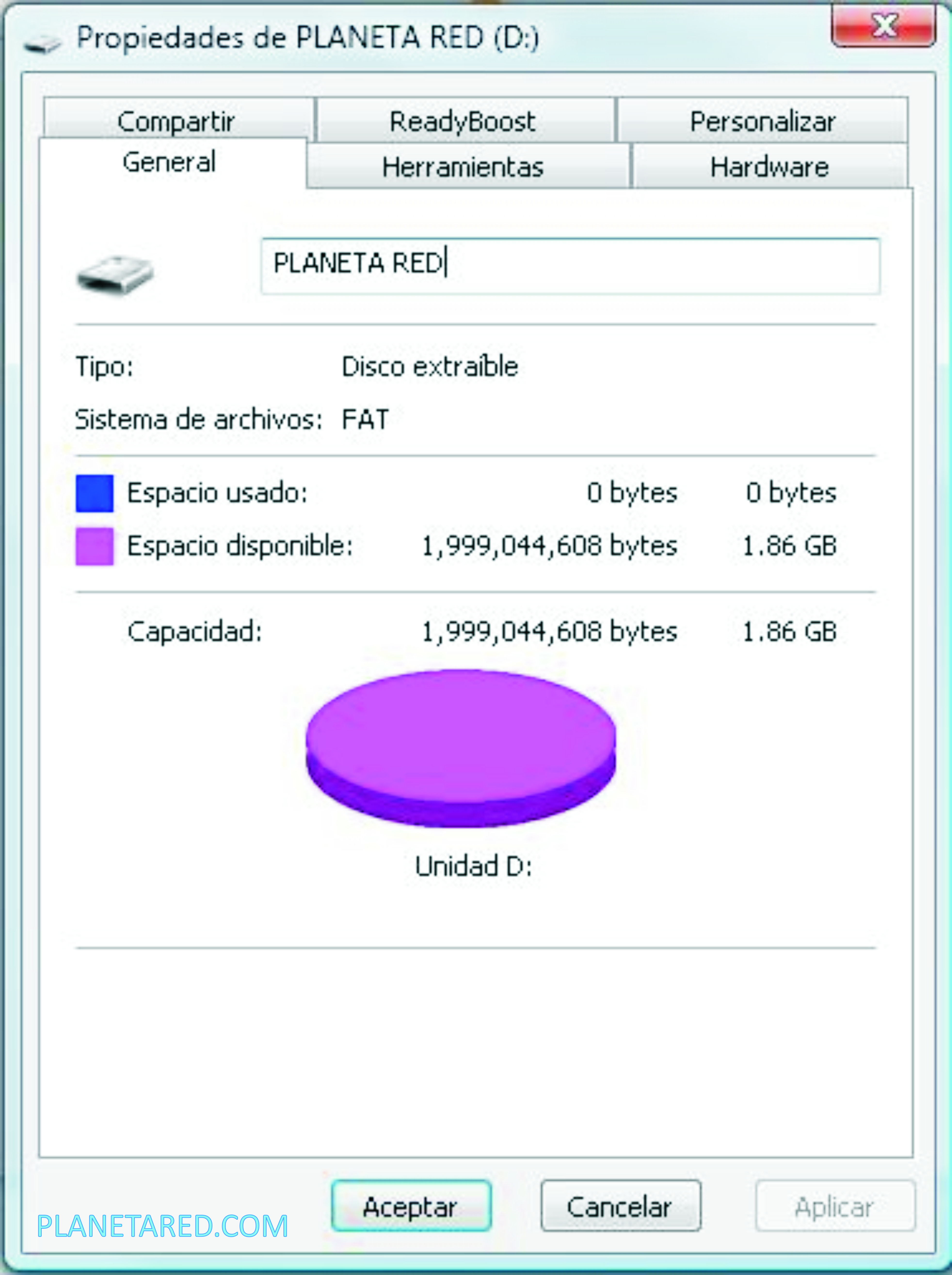 5. En la ventana de Propiedades que aparece, hacemos clic en la pestaña ReadyBoost.