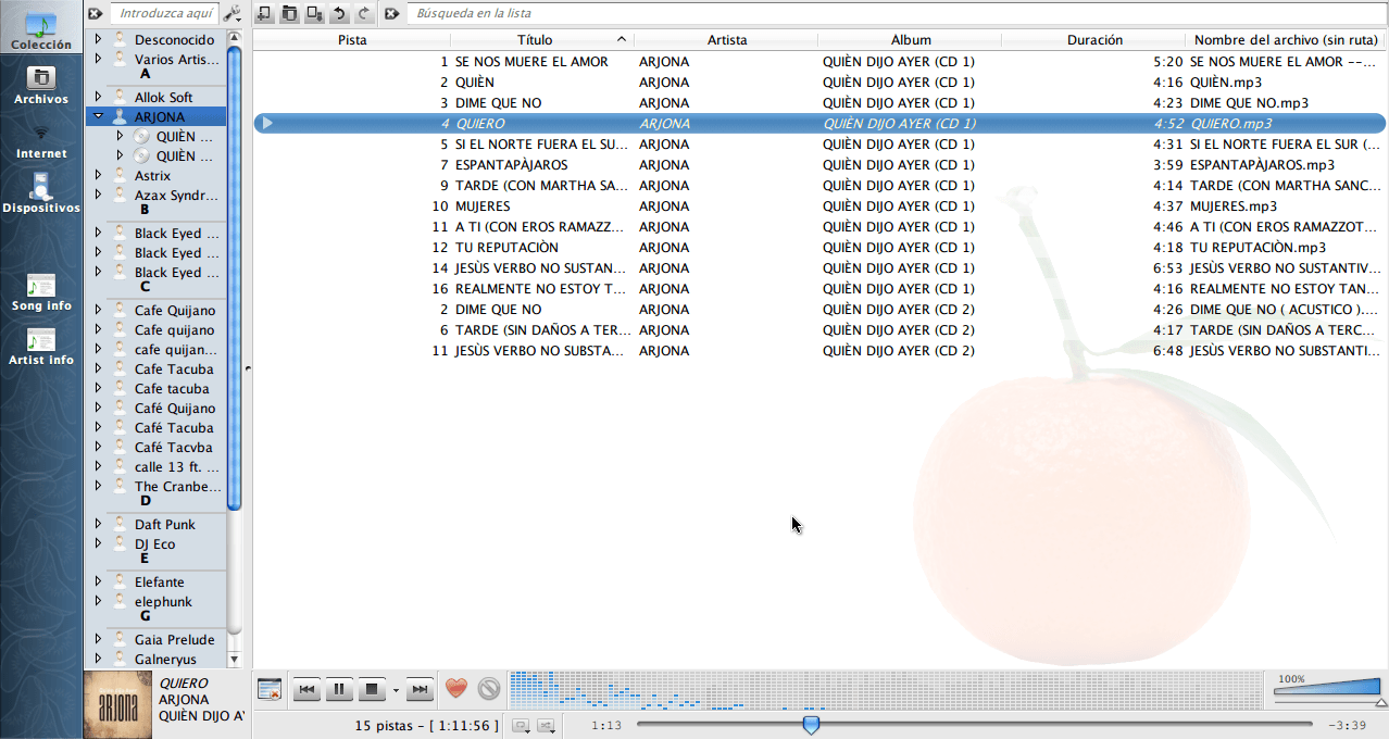 Y muchas mas que puedes conocer con instalarlo, en lo personal lo estoy probando y me esta dejan un buen sabor de boca, algo que me llamo la atención es el icono en nuestro panel el cual es un gajo de mandarina que poco a poco se va consumiendo con el tiempo de nuestra canción.