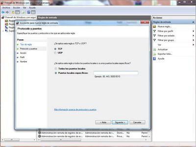 Luego elegimos entre abrir un puerto TCP o UDP (según la necesidad que tengamos) y seleccionamos la casilla Puertos Locales Específicos para luego indicar el número de puerto a abrir.