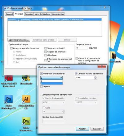 He probado esto activar la casilla de procesadores y poner 4, que son los que tiene este ordenador, y en cantidad maxima de memoria le puse 4, bueno el maximo que me deja. Al reiniciar el ordenador me a aparecido la pantalla azul mostrando un error bien gordo.no se por que pero windows ya no funcionaba. Despues de buscar y buscar, al iniciar de di a la tecla suprimir, y me salia la bios,Salí de la bios sin tocar nada y otra vez le di a la tecla suprimir.Alli me salieron varias opciones de arranque.La de modo seguro no funcionaba pero si me funcionó una que ponia modo seguro con linea de comandos o algo asi. es decir con el MSDOS. una vez dentro puse msconfig y se abrió el progama.Volvi a desactivar las casillas de numero de procesadores y la otra.Es decir lo dejé como venia al principio.Y POR FIN ya funcionaba.