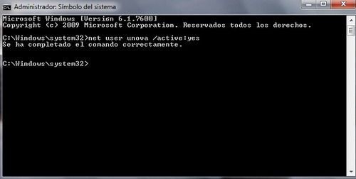 *Aclaración importante: debemos saber el nombre de nuestro usuario y reemplazarlo en los comandos indicados, por ejemplo, si nuestro administrator es unova, el comando quedaría de este modo: net user unova /active:yes