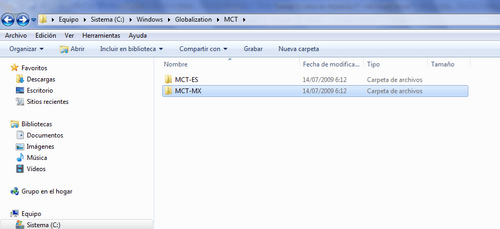 Luego veremos que en la ventana tendremos dos carpetas como opciones, una de estas es MCT-ES y la otra MCT-MX , nos dirigimos a esta última haciendo doble clic y dentro de temas o themes podremos ver algunas participaciones interesantes, como para cambiar de look nuestra apariencia en Windows 7.