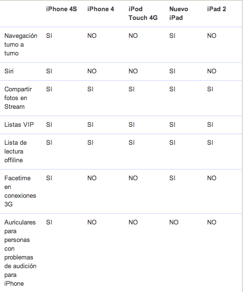 Como han visto en la tabla que les he dejado en la captura anterior, cuanto más nuevo sea el dispositivo, más sencillo será que puedan utilizar todas las funciones que se han estrenado en iOS 6. El nuevo iPad lo soporta casi todo, a excepción de los auriculares, y el iPhone 4s lo soporta todo. A medida que nos vamos alejando de los dispositivos nuevos son menos las opciones de las que disponemos, pero al menos, podemos actualizar dispositivos que se han quedado atrás como el iPhone 4, o el iPad 2..