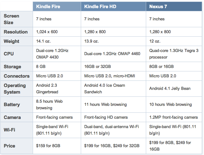 La que han visto en la anterior tabla es la comparativa al completo entre las tabletas, y si se fijan bien van a tener a una Amazon Kindle HD muy similar, o al menos que quiere parecérsele al máximo a la recién llegada hace poco Google Nexus 7, y lo notamos sobre todo en la igualdad de precio, que fue el factor decisivo para las buenas ventas que está cosechando Google con ella.