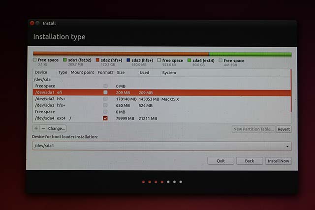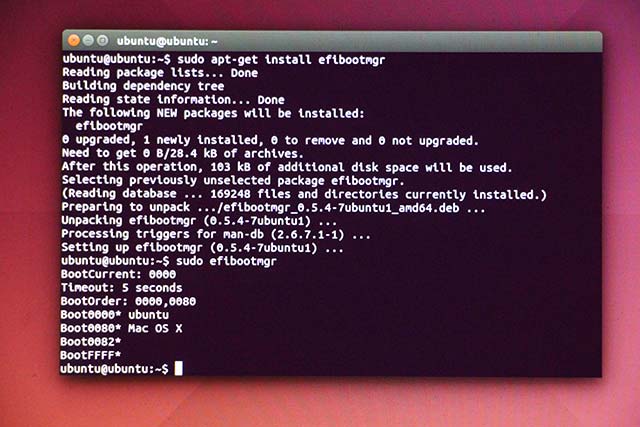Una vez que el programa instalador termine NO REINICIES todavía. Aquí viene el paso adicional que debemos hacer. Ejecuta el siguiente comando: sudo apt-get install efibootmgr. Esto instalará temporalmente una herramienta de configuración para inicio EFI. A continuación, ejecutaefibootmgr sudo . Esto mosntará la configuración de inicio actual por pantalla. Aquí, deberías ser capaz de ver «ubuntu» y » Boot0000 * «. Actualmente, el sistema EFI apuntará a Boot0080 *, que se salta GRUB y va directamente al Mac OS X. Para solucionar este problema, ejecute el comando sudo efibootmgr-o 0,80 . Ahora ya se puede reiniciar!