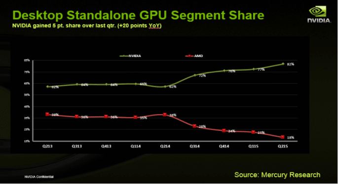 Esto sirvió a Nvidia para dar otro bocado al mercado, logrando pasar de una cuota de mercado del 76% en el Q4 de 2014 al 82% en el segundo trimestre de 2015, según los datos adquiridos por Mercury Research. Incluso después de la emisión de una serie de nuevos productos, AMD no ha logrado redimirse y ha perdido una preocupante cuota de mercado, hasta situarse en el 18%.