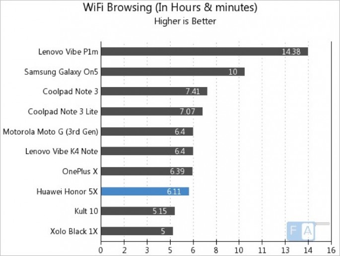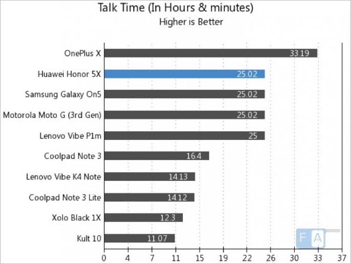 Los resultados han sido muy esperanzadores para el Honor 5X en cuanto al tiempo de conversación puesto que con sus 25 horas y 2 minutos se ha colocado segundo en un ranking dominado por el OnePlus X (más de 33 horas) y por delante de terminales muy bien valorados como el Samsung Galaxy On5 o el Moto G de tercera generación.