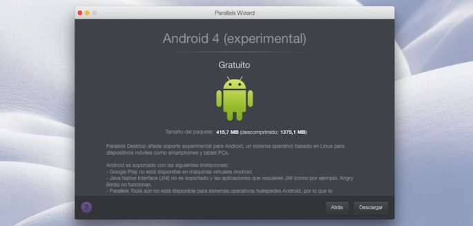La versión de Android que vamos a instalar en el Mac, es una versión que se encuentra en fase experimiental, como bien indica la aplicación y nos ofrece diversas limitaciones como no poder acceder a Google Play, no ofrece soporte para Java Native Interface y la limitación a la hora de compartir archivos entre OS X y esta versión de Android.