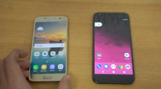 El siguiente video muestra algunas pruebas de velocidad realizadas entre el Galaxy S7 y el Pixel XL. El primero con la actualización oficial Android 7.0 nougat y el segundo con Android 7.1.1 Nougat, las versiones más actualizadas oficialmente para cada smartphone. La prueba comienza con una prueba de arranque que muestra los dos terminales encendidos al mismo tiempo. El narrador señala que ninguno de los dispositivos tiene utilizan la misma red Wi-Fi. El teléfono Samsung es un claro ganador en las pruebas de arranque, ya que está listo para la acción varios segundos por delante del Pixel XL.