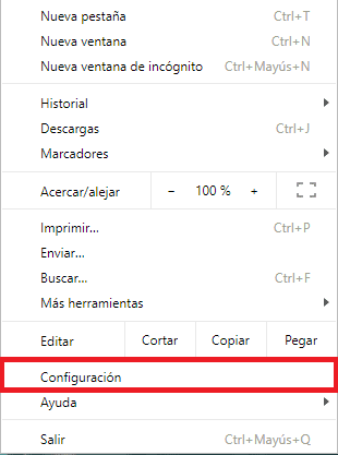Lo primero y principal será tener la sesión iniciada en Google Chrome. Una vez nos hayamos cerciorado y estemos dentro, seguimos adelante. Buscamos el panel de opciones del navegador (el símbolo de los tres puntitos en la esquina superior derecha) y lo desplegamos con un clic. Acto seguido buscaremos la pestaña configuración para acceder a opciones más avanzadas. Observa la imagen que te dejamos a continuación para que no te pierdas.