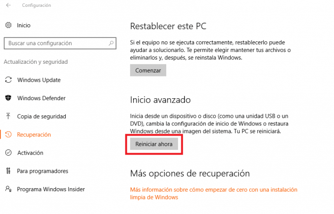 Usando cualquiera de estos métodos (Shift+Restart o la aplicación Settings) te lleva al entorno de recuperación.