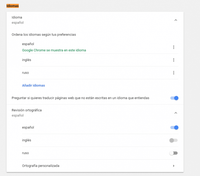 Una vez ahí, vamos abajo del todo y desplegamos las opciones avanzadas. Buscas el apartado «idiomas» y miras las diferentes opciones. Si no lo encuentras o eres vago… pulsa «F3» y escribe la palabra idiomas. Cuando lo hayas conseguido, activas opciones del siguiente apartado: