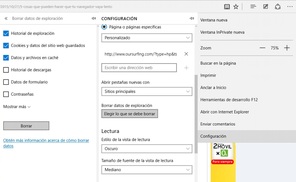 Para administrarlas en el explorador de Microsoft, haz clic en los tres puntos que están en la esquina superior derecha de la ventana y selecciona la opción Configuración, dirígete hasta la opción configuración avanzada y luego clic en el botón. Localiza la zona Privacidad y servicios y luego Cookies.