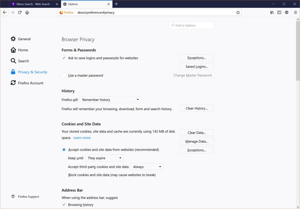 Para la versión de escritorio, lo primero es seleccionar el menú con tres líneas paralelas ubicado en la esquina superior derecha de la ventana de Firefox y elegir Options -> Privacy & Security. Ahora se debe acceder a Cookies and site data.