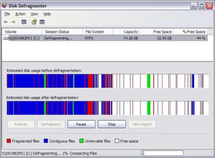 Navegue a INICIO>PROGRAMAS>Herramientas del Sistema ACCESORIO>Herramientas de Sistemas>DESFRAGMENTADOR DE RIESGOS. Tan pronto como haga clic en Disk Degragmenter, le mostrará cuánto están fragmentados sus discos. Por lo tanto, haga clic en un disco fragmentado y, a continuación, haga clic en Disco de desfragmentación. Es todo.