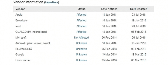 Según la lista CERT, los dispositivos de Apple, Intel y Qualcomm se han visto afectados por la vulnerabilidad Bluetooth. Cabe señalar que Apple e Intel ya han lanzado actualizaciones de firmware y software para solucionar la vulnerabilidad. No se sabe si Google, Android Open Source Project (AOSP) y Linux también se han visto afectados. Microsoft no es parte de la lista.