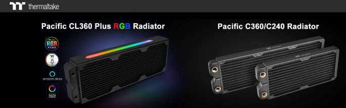 Los radiadores Thermaltake Pacific C360 y C240 son radiadores ultra-delgados diseñados con radiadores de 27 mm de espesor, junto con diseños de tubo plano de 12 juegos y tanques de latón, presentan paneles laterales de acero inoxidable exclusivos que garantizan la durabilidad y reducen el peso del radiador. Están fabricados con un diseño de aleta de cobre.