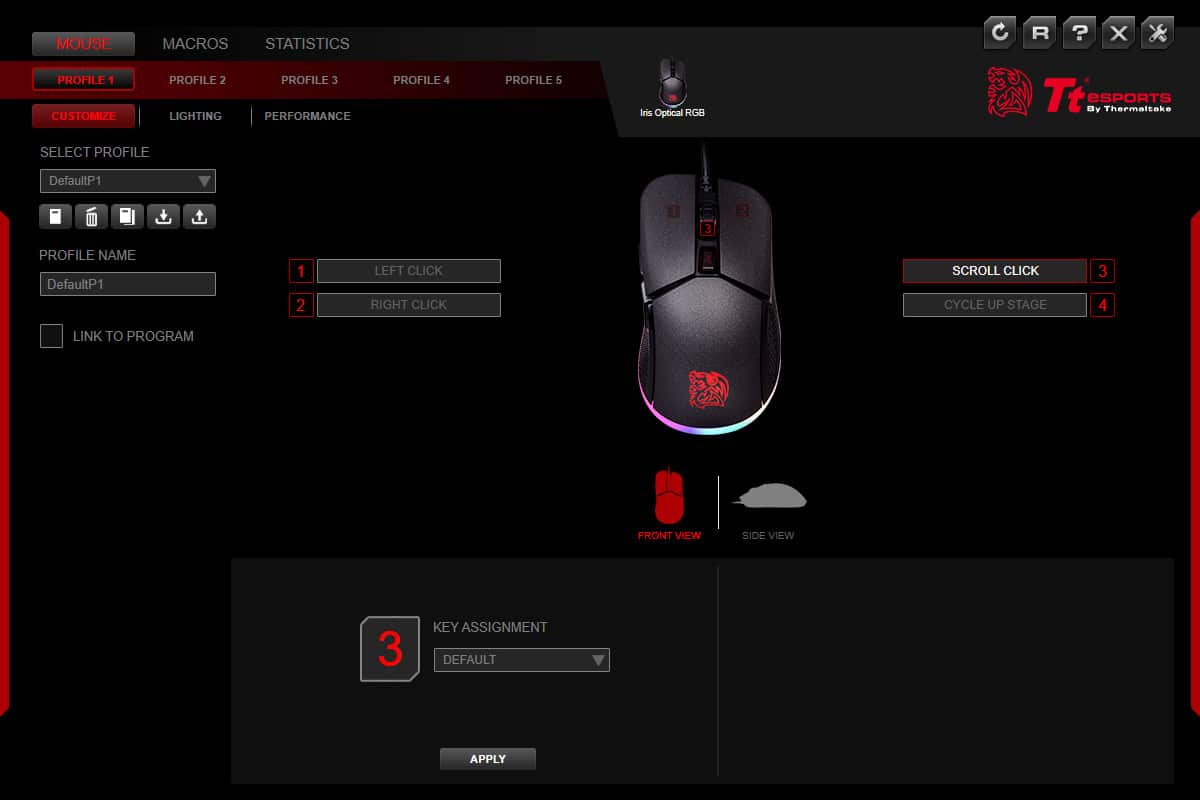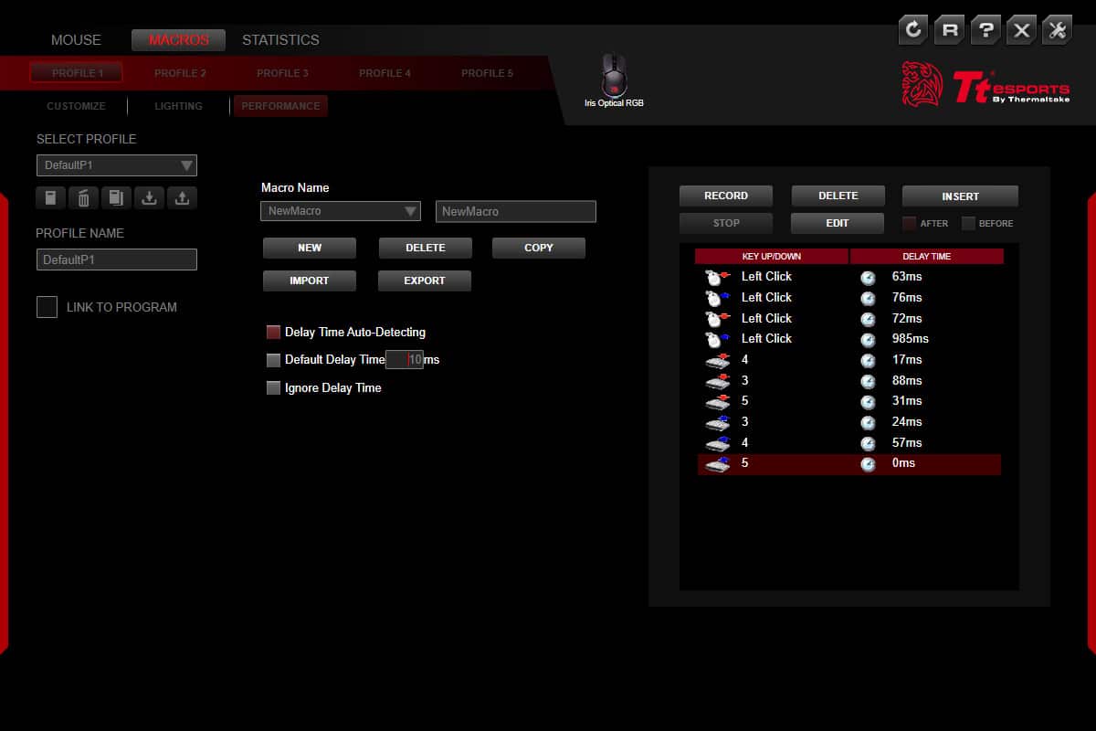 Los perfiles se pueden configurar en el lado izquierdo de la ventana. Existen cinco perfiles predeterminados, pero puede crear nuevos, importarlos y exportarlos o copiar la configuración de un perfil existente. La pestaña «Personalizar» nos permite establecer las asignaciones de las teclas: debe hacer clic en el botón Vista lateral para acceder a las opciones de los botones laterales. La pestaña «Macros» se encuentra en la parte superior izquierda de la ventana del software, y aquí puede configurar sus diferentes comandos de macro. La pestaña «Performance» tiene la configuración del sensor, así como el botón deslizante de respuesta. Puede tener hasta cuatro perfiles de sensibilidad, pero puede eliminar los existentes.