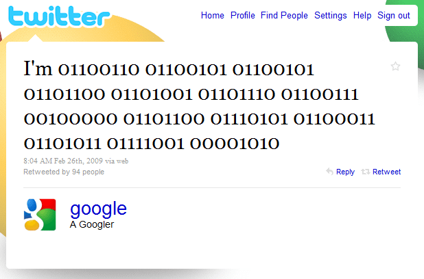 El primer tweet de google fue » “I’m 01100110 01100101 01100101 01101100 01101001 01101110 01100111 00100000 01101100 01110101 01100011 01101011 01111001 00001010.” Si no eres muy ducho en el código binario, quiere decir “I’m feeling lucky.”