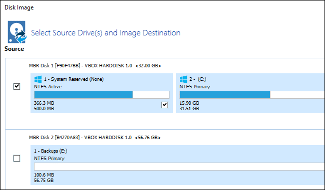 Elige los discos y particiones individuales de los que deseas crear una imagen de copia de seguridad. Para realizar una copia de seguridad de todo, selecciona todos los discos y particiones.