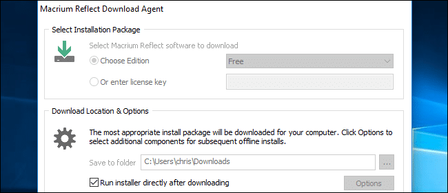Descarga Macrium Reflect Free para comenzar. Cuando se le pida que seleccione una edición, simplemente seleccione la edición «Gratuita». Se descargará y ejecutará el instalador apropiado.