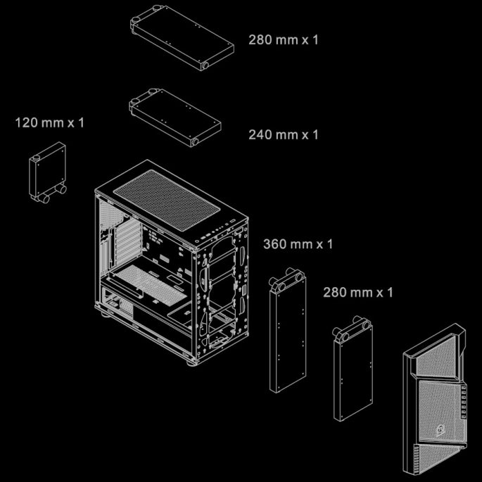 | Radiatores | Frontal: 1 x 360mm, 1 x 280mm Superiores: 1 x 240mm, 1 x 280mm Traseros: 1 x 120mm |