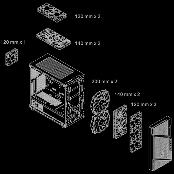 | Ventiladores | Frontal: 3 x 120mm, 2 x 140mm, 2 x 200mm Superiores: 2 x 120mm, 2 x 140mm Traseros: 1 x 120mm |