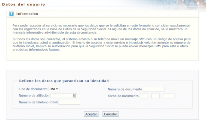 En caso de preferir este servicio, tendremos que rellenar algunos campos. En concreto son DNI, fecha de nacimiento, número de teléfono móvil y número de afiliación. Si tu número está registrado en la base de datos de la Seguridad Social, en breves instantes te llegará un código al móvil para poder introducirlo en la web y descargar el Informe de vida laboral.
