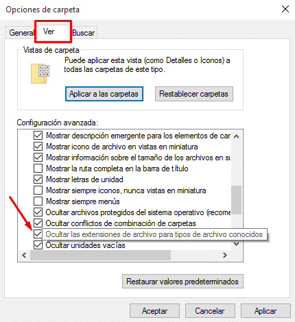- Activa la casilla que dice «Mostrar todas las extensiones de nombres de archivo«