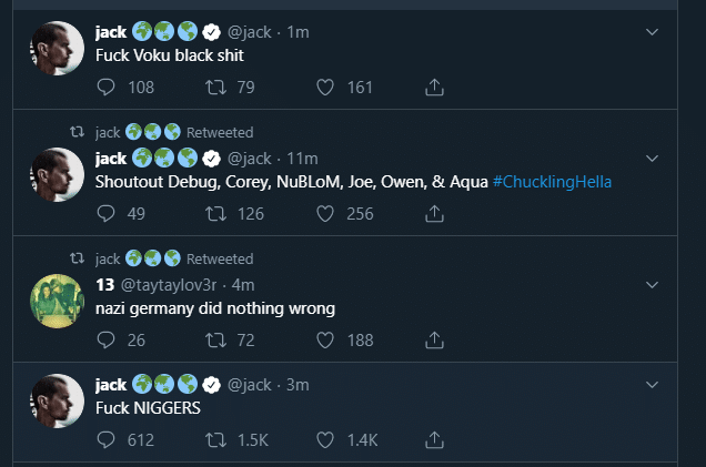 Las publicaciones de la cuenta de Jack Dorsey, una cuenta verificada aparecieron en el registro justificando las acciones de la Alemania nazi y llamando a la violencia. Algo que se puede ver en la siguiente captura: