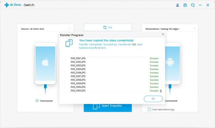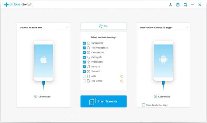 El problema llega cuando cambiamos de iOS a Android o de Android a iOS. A estas empresas parece que no les gusta demasiado que sus usuarios hagan esto…pero con dr.fone – Switch este proceso de cambio de teléfono será mucho menos traumático. Como ya os hemos contado esta aplicación nos ayudará a la hora detransferir todo tipo de datos. Permite transferir mensajes de texto desde Android a iPhone, contactos, nuestras fotografías, música, calendario, etc. de un teléfono a otro sin problemas. Pudiendo transferir también otros elementos que son menos habituales como la lista negra de contactos, el historial de llamadas, nuestros marcadores, las notas de voz, las alarmas, o los tonos de llamada y fondos de pantalla.