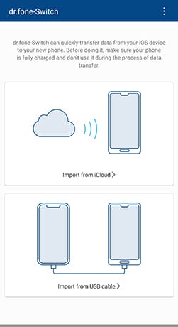 Paso 1. Tan sólo tendremos que abrid la versión Android de dr.fone – Switch, y pulsar sobre la opción «Importar desde cable USB». A continuación, utilizaremos un cable adaptador de iOS a Android para conectar nuestro iPhone a nuestro terminal Android.
