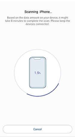 Paso 2. A continuación la app comenzará a escanear los datos del iPhone. El tiempo que llevará esta operación dependerá de la cantidad de datos almacenados en el iPhone.