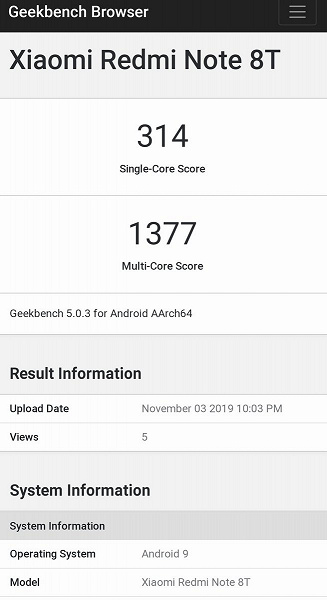 Uno de nuestros queridos usuarios de Twitter, el indio Mukul Sharma, que publica regularmente información confiable sobre lo último en la industria móvil, publicó los resultados de las pruebas para el smartphone Redmi Note 8T en el popular sitio de benchmarks de Geekbench.