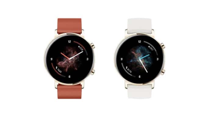El Huawei Watch GT 2 también viene en algunos nuevos «sabores». Ofrece una variante de 42 mm que llega en una caja con color Champagne Gold, con correas Frosty White y Chestnut Red.