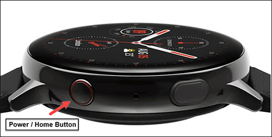 - Una vez que el dispositivo esté apagado, mantenga pulsado el Botón de encendido hasta que aparezca el logo del Reloj Samsung Galaxy Active2, y luego suéltelo.