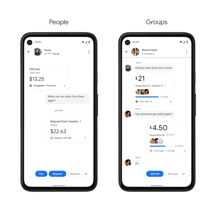 Además de los chats personales, también se admiten los chats grupales; por ejemplo, puede dividir la cuenta de un restaurante con amigos. Sí, monobank ha tenido esto durante mucho tiempo . Pero Google fue un poco más allá: directamente en el chat, puede realizar un seguimiento de los pagos y, si es necesario, recordarle con la solicitud de traducción correspondiente.