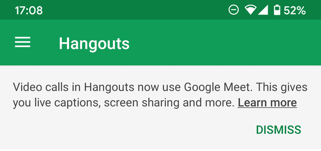 Cuando inicias Hangouts por primera vez después de la actualización, aparece una notificación con el siguiente contenido: