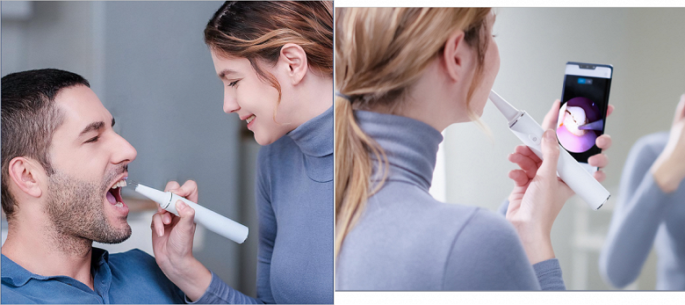 El dispositivo contiene una cámara endoscópica profesional que transmite imágenes desde la cavidad bucal a nuestro teléfono a través de nuestro Wi-Fi. Este dispositivo también cuenta con un indicador LED en la punta que nos permite iluminar el área que vayamos a tratar. La eliminación de la placa dental se realiza mediante ultrasonidos.