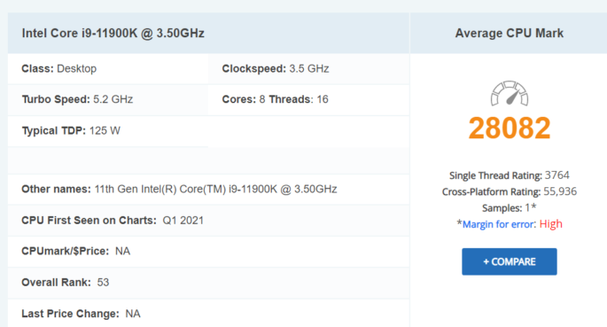 A medida que se acerca la línea de tiempo para el anuncio oficial de los nuevos procesadores Rocket Lake-S de Intel, aparece más y más información sobre estos dispositivos en Internet. La semana pasada tuvimos la oportunidad de familiarizarnos con el consumo de energía y el calentamiento del chip insignia Core i9-11900KF (con núcleo de gráficos desactivado) en una prueba de esfuerzo, y hoy para los potenciales compradores interesados, datos sobre los resultados de las pruebas del Core i9 -Se publica el procesador 11900K en PassMark.