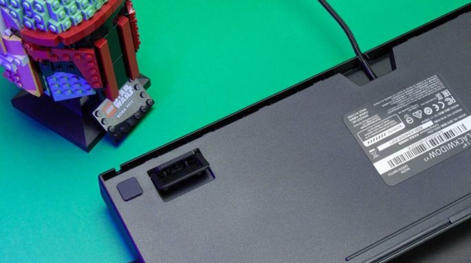 El Razer Blackwidow V3 es un teclado con cable. Incluye un cable recubierto con nylon para asegurar su larga vida que sale desde la parte central. El V3 incluye unas ranuras para sacarlo por cualquiera de los dos lados. Tiene una longitud de 1.8 metros, que es una buena longitud. No es extraíble.