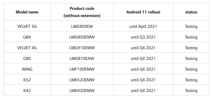 LG aclaró que tras el cierre de la división de móviles, los smartphones insignia Velvet, Wing, así como los modelos de las series 2019 y V y más recientes obtienen tres años de soporte con actualizaciones completas de Android (nuevas versiones, no actualizaciones de seguridad). Para algunos modelos de smartphones de 2020, incluidos los modelos LG Stylo y la serie K, la compañía promete dos importantes actualizaciones de Android.