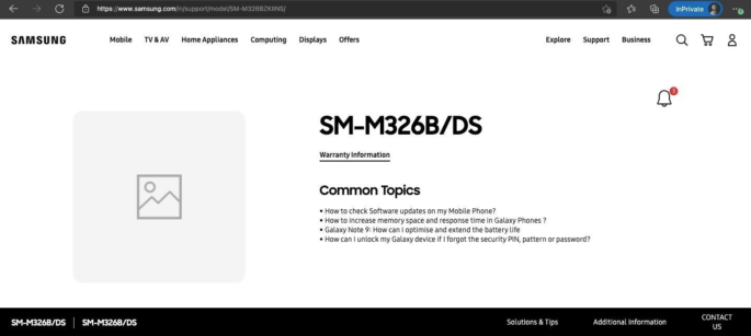 La página de soporte solo menciona el número de modelo SM-M326B / DS del Galaxy M32 5G y no tiene información sobre sus especificaciones. El mismo número de modelo se vio en Geekbench el mes pasado.