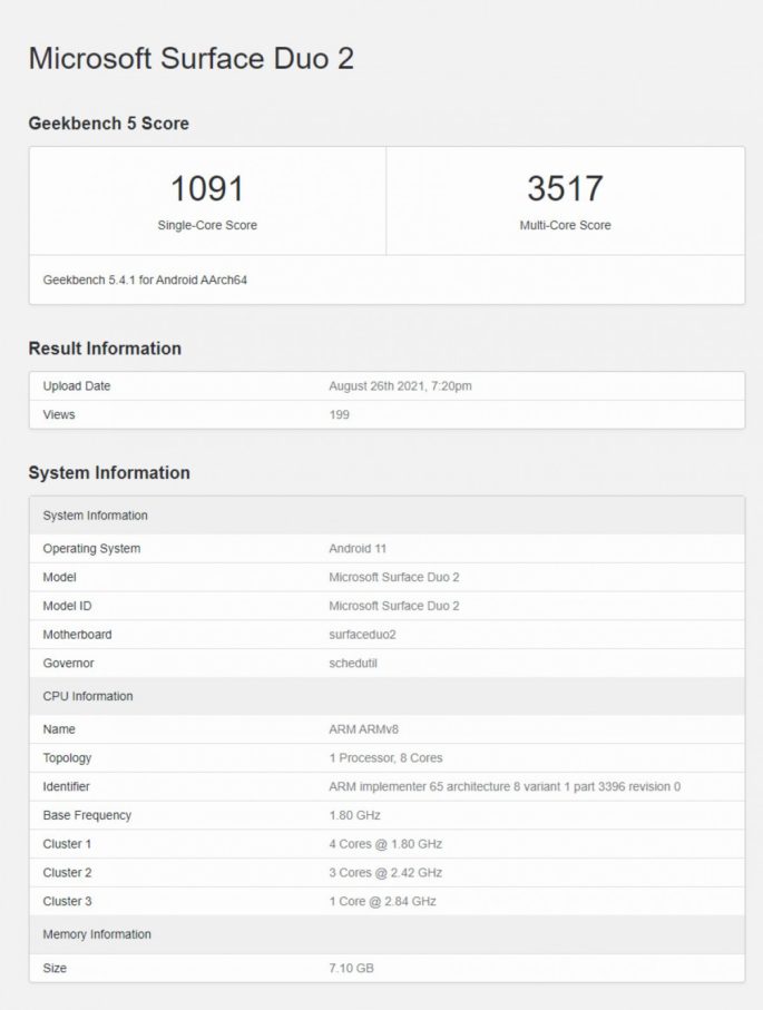 Por supuesto, aún no tenemos una lista de todas las caracteristicas del Microsoft Surface Duo 2. Pero su paso por el Geekbench nos asegura cuál va a ser su motor, y esta vez el procesador de alta gama Snadragon 888 de Qualcomm es el elegido, una excelente noticia en vista de los precios con que se manejan estos dispositivos plegables. Y la puntuación obtenida en la prueba ha sobrepasado los 1.900 puntos (la de un core) y más de 3.500 puntos (en la multi-core). Como referencia, el Galaxy Z Fold3 5G había obtenido 979 y 3441 puntos respectivamente en el mismo test y con el mismo procesador.