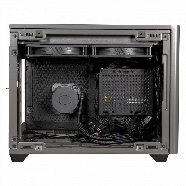 El panel superior tiene puntos de montaje para dos ventiladores de 120 mm o 140 mm. La caja está equipada con un LSS, y aquí se fija un radiador de 280 mm con dos ventiladores SickleFlow PWM de 140 mm. El diseño del LSS también incluye un bloque de agua del procesador y una bomba.