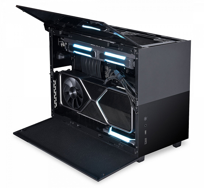 Y lo mismo si hablamos de los ventiladores. En la versión con la fuente de alimentación SFX, podremos colocar un par de ventiladores de 120 mm o 140 mm se colocan en la parte superior, y en la versión con la fuente de alimentación ATX, solo podremos instalar uno. De cualquier manera, se puede colocar otro ventilador de 120 mm en la parte inferior de la carcasa.