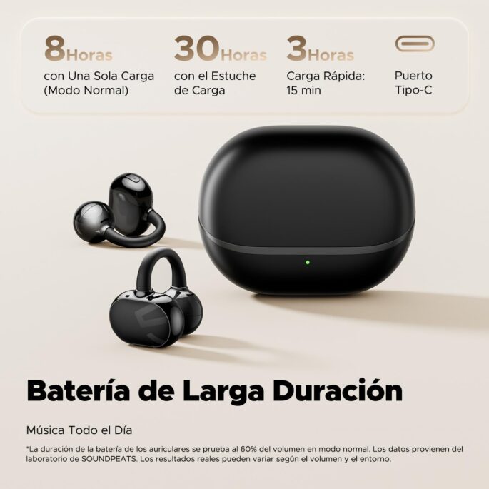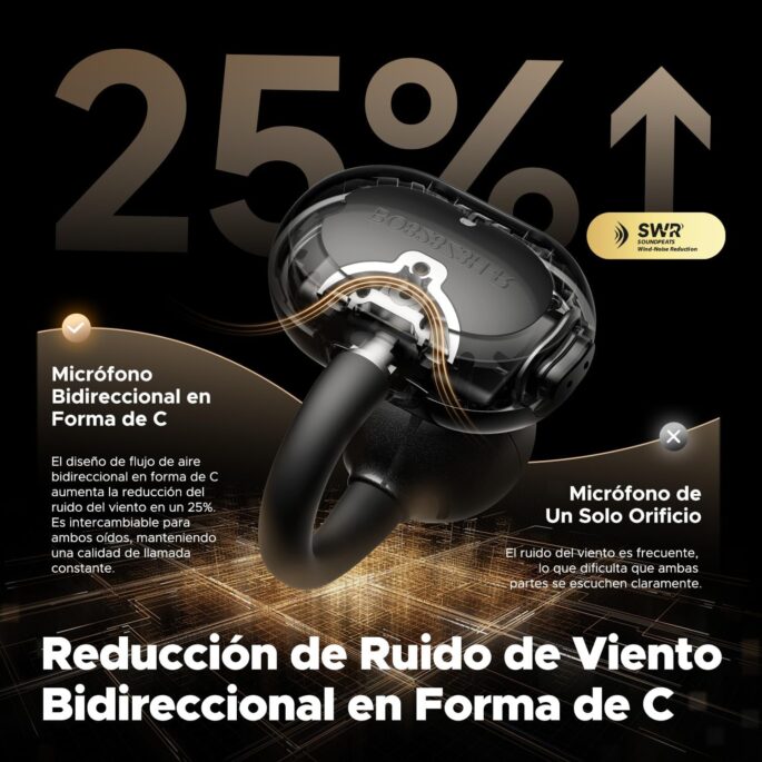 Estos SoundPEATS POP Clip incorporan una cámara con diseño en «C» bidireccional que reduce el ruido del viento hasta en un 25 %, mejorando la claridad durante llamadas y reproducción al aire libre. También cuenta con micrófonos ENC asistidos por IA para filtrar ruidos de fondo y lograr una voz más natural en las conversaciones.