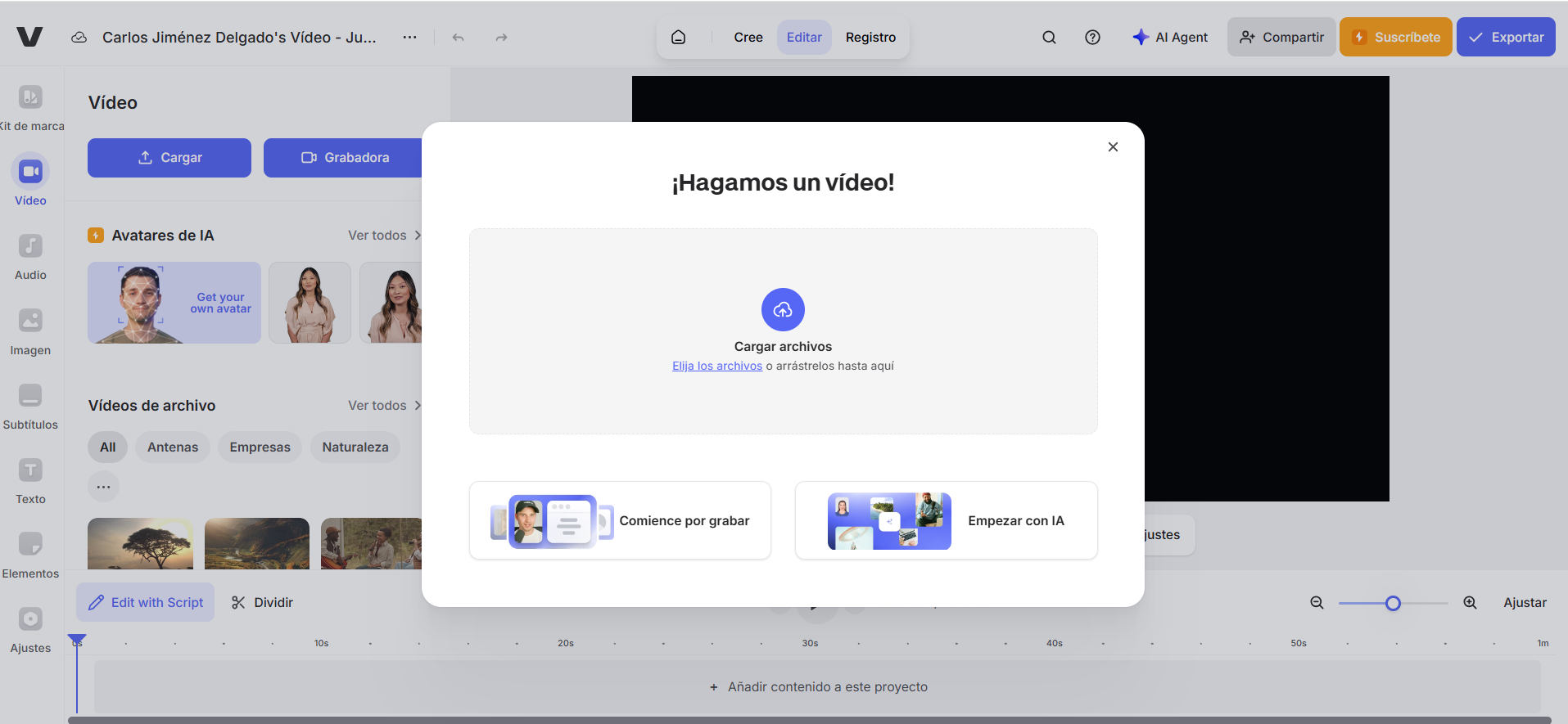 En este punto subimos los videos que hemos grabado previamente a la plataforma, para que podamos tener una primera base con la que empezar a trabajar. Aunque esto no es realmente necesario ya que como os hemos indicado vamos a usar principalmente la herramienta de texto a voz.